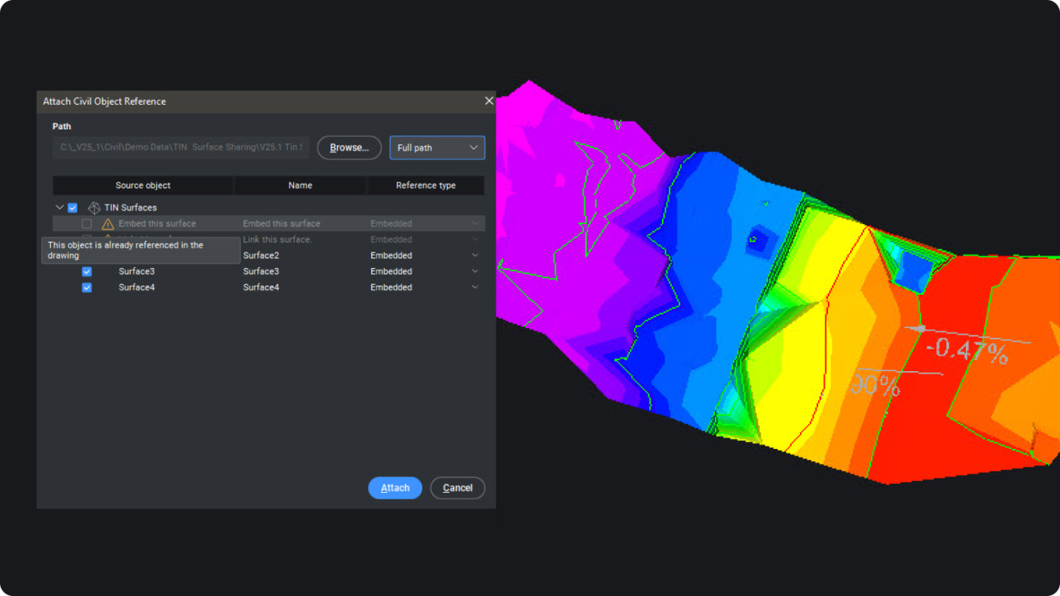 Saiba como as Superfícies TIN podem ser compartilhadas dinamicamente entre desenhos, reduzindo o tamanho do arquivo e desbloqueando fluxos de trabalho paralelos.