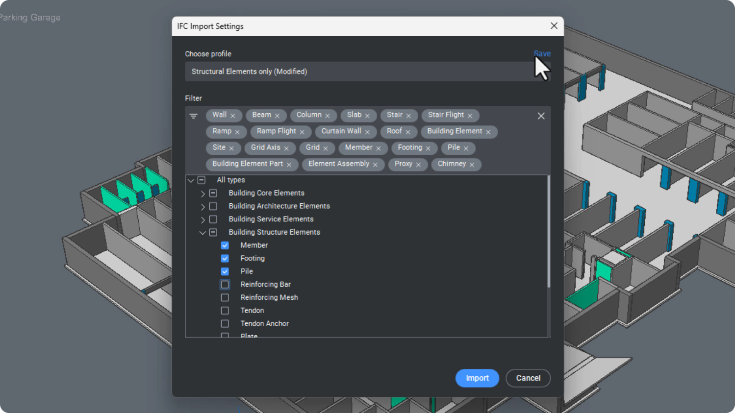 Salvar as configurações do perfil a partir da caixa de diálogo Configurar IFC Importar.